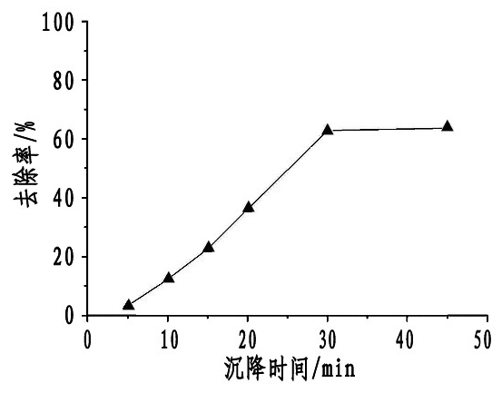 由上圖可知,在前30 min內(nèi),總磷去除率隨著沉降時(shí)間的延長(zhǎng)而增加,但當(dāng)沉降時(shí)間大于30 min后,隨著時(shí)間的延長(zhǎng),去除率幾乎沒(méi)有變化,說(shuō)明在30 min時(shí),沉淀絮體已經(jīng)基本沉淀完成。溶液沉降的目的是使懸浮的污染顆粒物沉降到溶液底部。因此當(dāng)溶液中懸浮物沉降完全的時(shí)候,繼續(xù)靜置將不會(huì)再有明顯效果。結(jié)合實(shí)際生產(chǎn)需要,沉降的最佳時(shí)間為30 min。