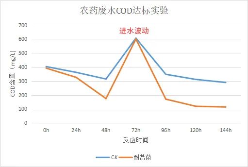 處理后效果:菌劑投加2日后出水降低,5日后出水COD穩定達標,7天后穩定在70mg/L以下,生化系統COD降解能力明顯好轉。