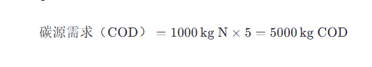 假設一個污水處理系統需要去除1000kg的總氮(以硝酸鹽氮計),并且采用的C/N比為5:1,則需要的碳源(以COD計)為: